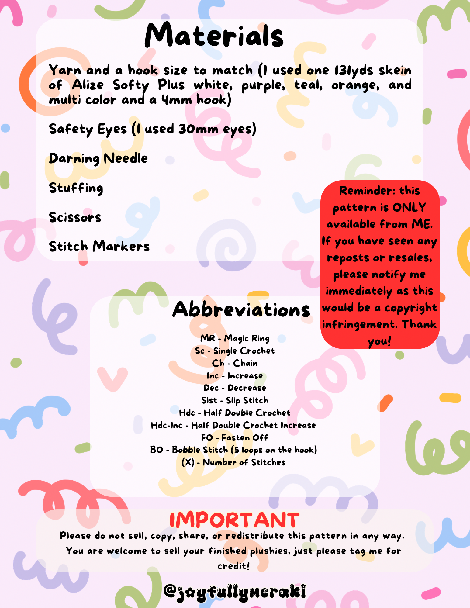 This pattern is for your personal and commercial use only. Meaning, you are welcome to sell what you create from this pattern as long as credit is given to Joyfully Meraki, or @joyfullymeraki.