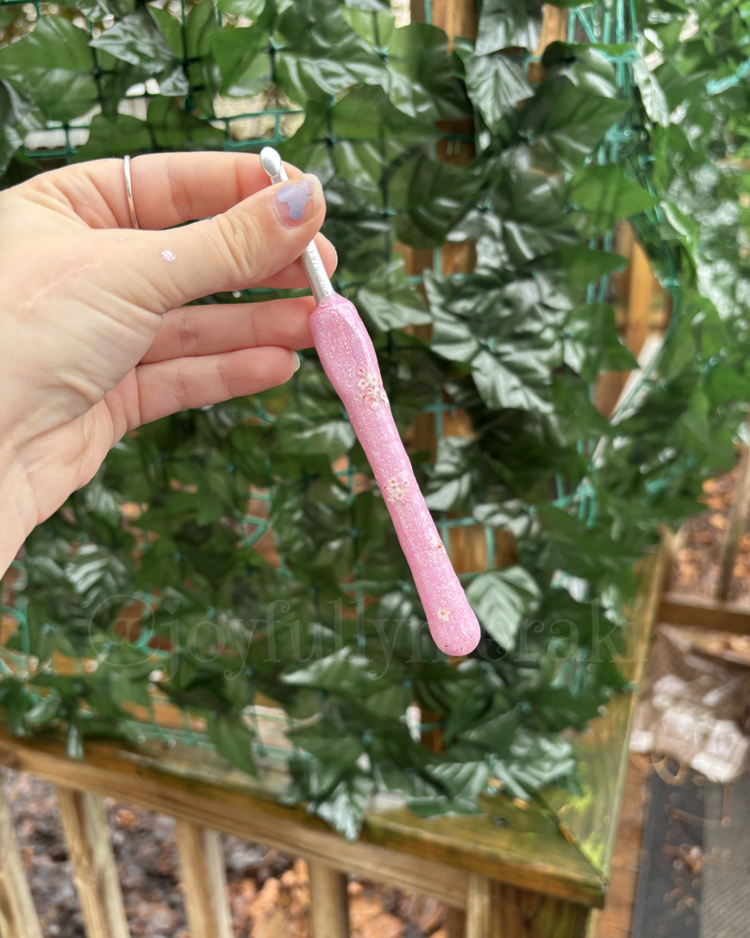 This custom crochet hook is individually hand painted and professionally sealed in a smooth, crystal-clear resin finish for lasting durability and shine. Each piece is carefully crafted in small batches, making every hook truly one of a kind.